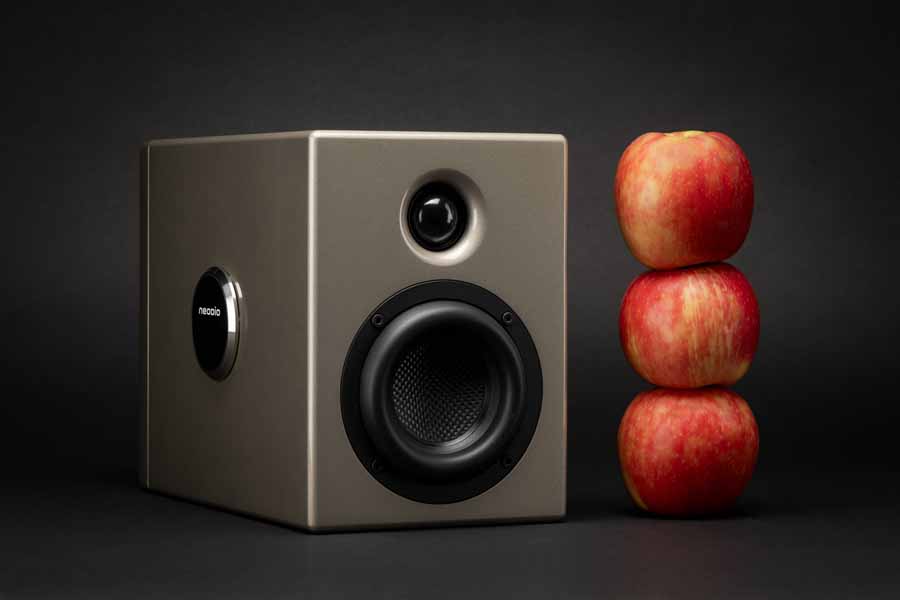 Il cuore tecnologico del Lilli è costituito dai driver prodotti su misura da Kartesian. Il woofer da 100 mm in alluminio e carbonio offre secondo Neodio grandi escursioni e basse distorsioni ed è affiancato da un tweeter soft dome da 28 mm con magnete in neodimio. La vicinanza tra i due trasduttori, all’interno di un cabinet così compatto, punta a ricreare un immagine stereo coerente e naturale, un elemento fondamentale per chi ricerca un ascolto immersivo in spazi domestici limitati.