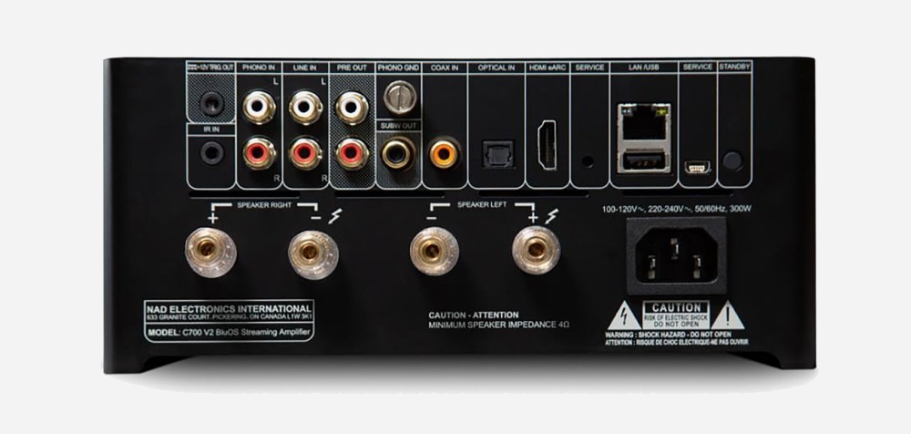 Grazie poi all’interoperabilità di BluOS, è possibile associare al C700 V2 qualsiasi prodotto BluOS per ampliare e gestire meglio i diversi collegamenti in una catena audio multi-room. Con il Nad C700 V2, è possibile ad esempio allestire un impianto audio a 4.1 canali aggiungendo due speaker surround attivi BluOS (come quelli di Bluesound) e un subwoofer cablato, in modo da sfruttare al meglio l’inserimento del C700 V2 in una catena audio-video grazie alla presenza dell’HDMI eARC.