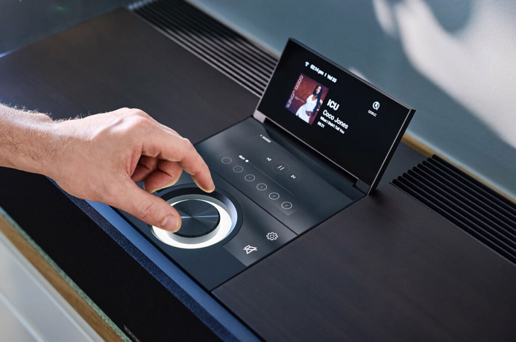 Anche l’interfaccia è stata pensata per offrire praticità e flessibilità. L’utente può controllare il sistema tramite il touchscreen rotante integrato, con il telecomando Prisma oppure via app tramite dispositivi mobili. Dal punto di vista estetico e dell’integrazione negli ambienti domestici, l’Allt-I-Ett può essere posizionato su un mobile in modalità freestanding, fissato alla parete o collocato in un angolo, a seconda delle esigenze. Le dimensioni – 690 x 303 x 150 millimetri (che diventano 230 millimetri in altezza con il touchscreen sollevato) – e il peso di 16 Kg confermano inoltre la sostanza del progetto, senza sacrificare troppo in termini di ingombro.