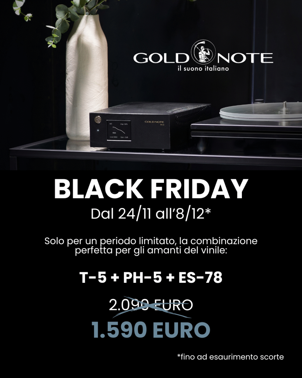 Il Black Friday si fa più interessante che mai per gli appassionati di vinile. Gold Note, storico brand hi-fi italiano, lancia una promozione davvero interessante dedicata a chi vuole entrare nel mondo dell’analogico senza compromessi: fino all’8 dicembre 2025, la combinazione T-5, PH-5 ed ES-78 viene proposta a 1.590 Euro invece di 2.090 Euro, con disponibilità limitata presso rivenditori autorizzati del distributore italiano Tecnofuturo.