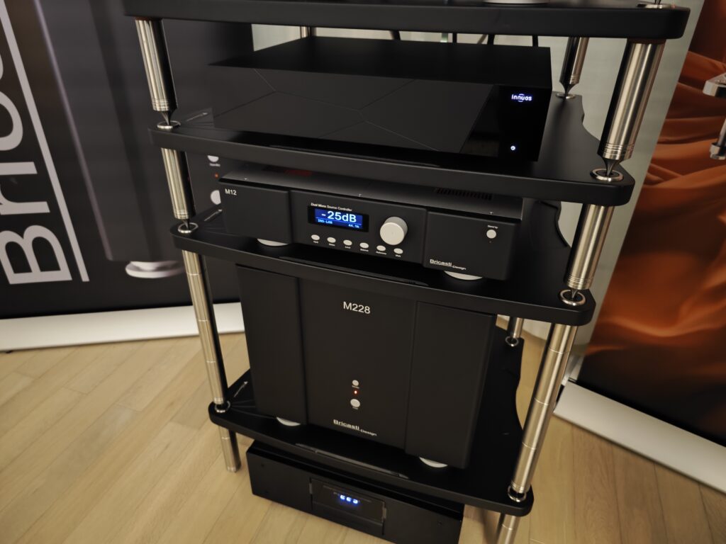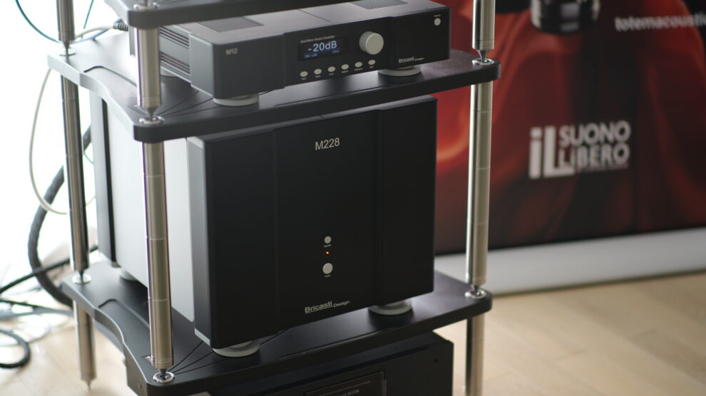Ecco, in questa sala abbiamo avuto la possibilità di capire qual è probabilmente il pregio da non sottovalutare di Degustazioni Musicali 2026: la dimensione a misura d’uomo e l’attenzione di un pubblico rispettoso che rendono possibile un ascolto più intimo e rivelatore, difficilmente replicabile nelle grandi fiere di settore. Se poi a questo aggiungete la disponibilità ed il piacere del personale di sala nel raccontare il setup avrete fatto centro. Tornando a noi, nella sala di Audio Graffiti Mantova, oltre alle Totem Acoustic Elemental V2 c’erano ad aspettarci il nuovo finale Bricasti Design M228, pilotato dall’ M12 preamplifcatore e DAC a cui si aggiungevano il DAC a resistenze M11 serie due e la meccanica CD/SACD M19. In questa sala abbiamo potuto apprezzare appieno la tecnologia torrent di Totem Acosutic che prevede l’adozione di crossover che definire minimalisti è un eufemismo. Le Element Metal V2 restituivano un suono tridimensionale, olografico, materico ed anche quando abbiamo cercato di mettere il setup in difficoltà con brani veramente difficili non tanto per il setup quanto per l’ambiente, il risultato è stato decisamente appagante. Le Element Metal V2 pur non essendo nel loro ambiente ideale per dimensioni, hanno tirato fuori una performance veramente al di sopra di ogni sospetto, che con il tormentone audiofilo The Sound Of Silence nella verisone di Geof Castellucci ci ha fatto sentire le note più gravi mentre l’M228 dava sfoggio del suo infinito dumping factor che regalava un controllo ineccepibile.