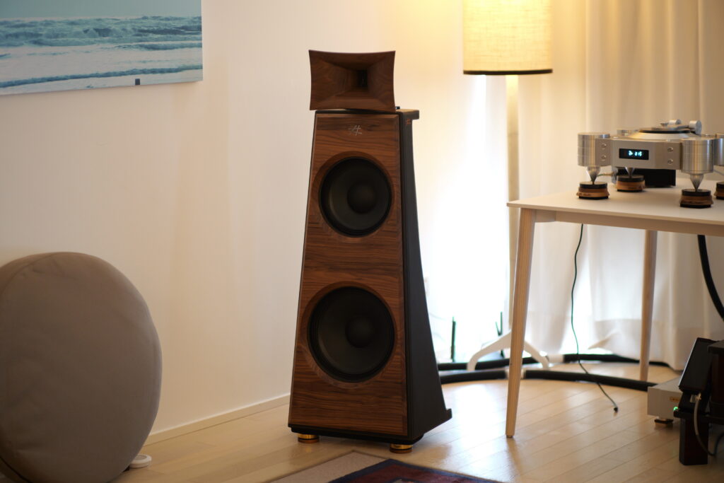 Il posizionamento dei diffusori è decisamente azzeccato, come azzeccata è la scelta di disporre il setup sul lato opposto e non i mezzo alle Bison Tower. Il suono che ne scaturisce è un suono tridimensionale, veloce, trasparente ma che non affatica, in sostanza questa sala sta riproducendo quello che è il pensiero di Totem Acoustic e lo sta facendo in una sala tutt’altro che facile dal punto di vista acustico. Come dice Stafano Marchi nel nostro video reportage Riccardo Franceschini ha dimostrato, come se ce ne fosse bisogno che il “manico” e l’esperienza non gli mancano e soprattutto tutti questi fattori hanno confermato ancora una volta la grande capacità dei diffusori Totem Acosutic di riuscire ad adattarsi con estrema facilità a qualsiasi tipo di ambiente. Se vi state chiedendo cosa sono quei “corni” sopra le Totem sono dei risuonatori.