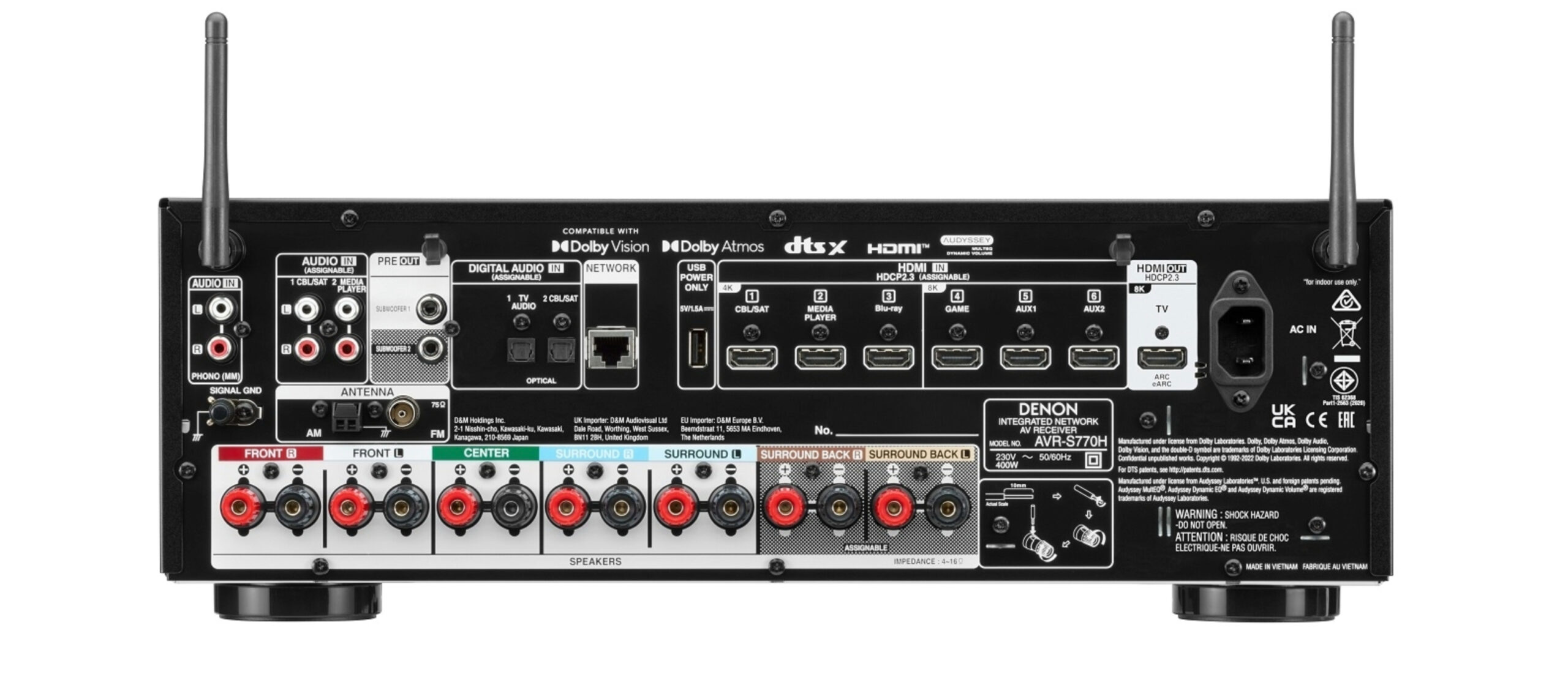 Inoltre, includono il software Audyssey MultEQ per una calibrazione accurata che ottimizza l’esperienza audio nell’ambiente di ascolto. L’AVR-S770H può essere configurato in un sistema audio surround 7.2 o 5.2.2 con Dolby Atmos e DTS:X. I modelli AVR-S670H e AVC-S670H supportano invece l’audio surround 5.2 tramite DTS:X, Dolby TrueHD e DTS HD Master Audio.
