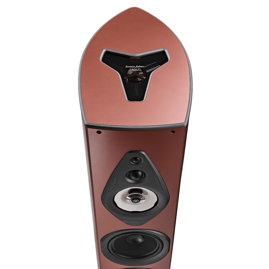 In un’inedita scelta tecnica, questi trasduttori non sono alloggiati in un tradizionale cabinet di legno, ma in una camera smorzata con sughero, materiale sostenibile e dalle proprietà acustiche uniche. L’uso del sughero, irregolare e organico, contribuisce a scolpire il volume interno e a donare al medio quel carattere liquido e naturale che da sempre definisce il suono Sonus faber.