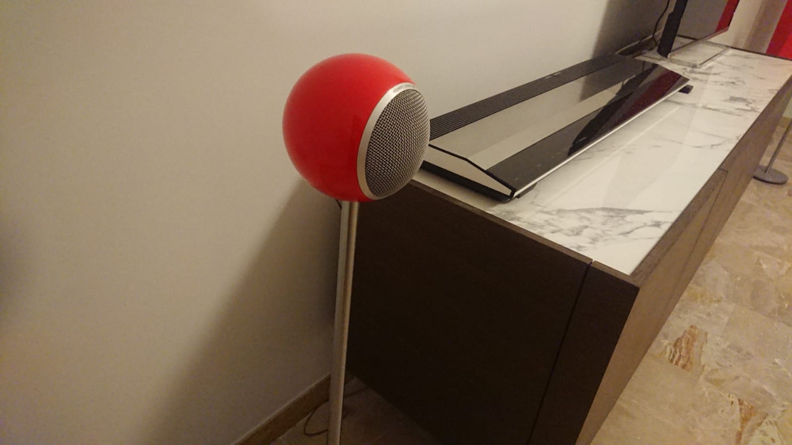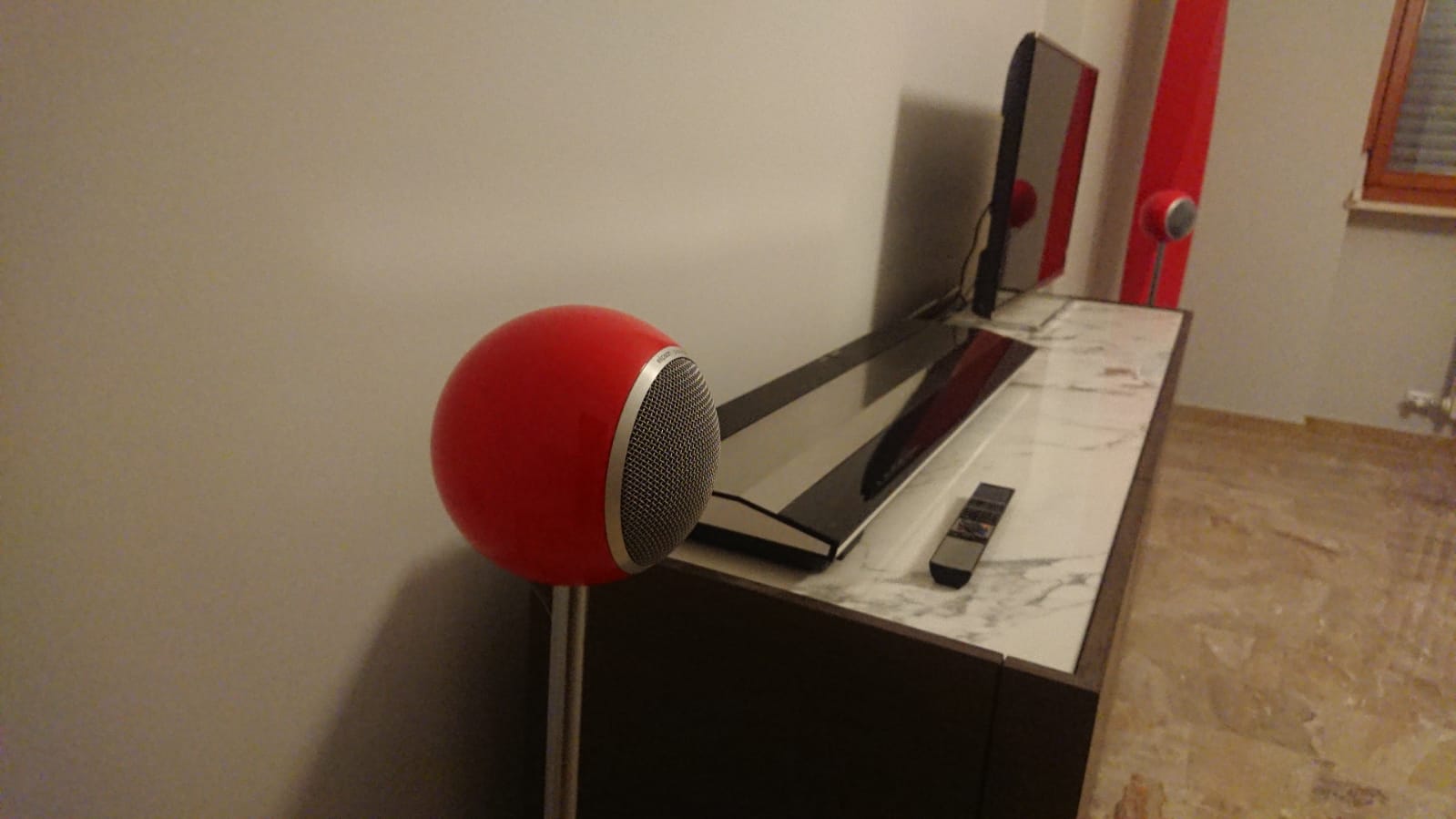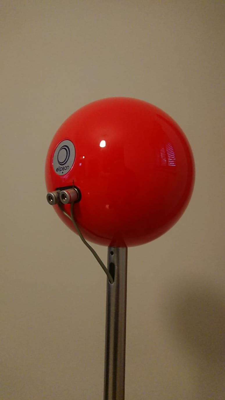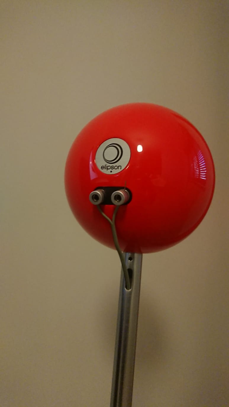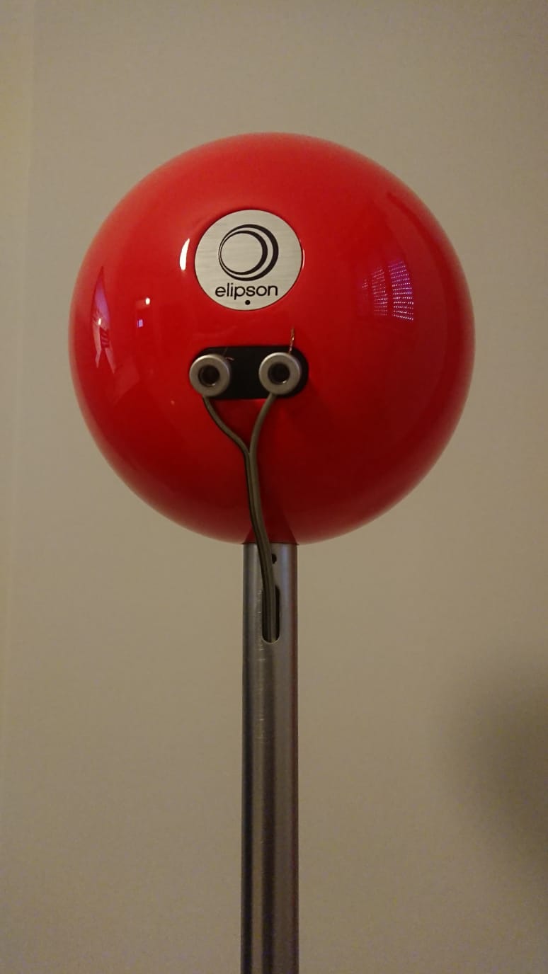 La confezione si presenta molto curata, le due sfere, laccate rosse lucido con un livello maniacale da far invidia alle laccature di un pianoforte Steinway, sono messe in due sacchetti di panno chiusi da un laccio. All’interno guanti bianchi per non lasciare impronte sui diffusori e due supporti ad anello in alluminio per appoggiarle sul ripiano, oltre al manuale d’uso.
