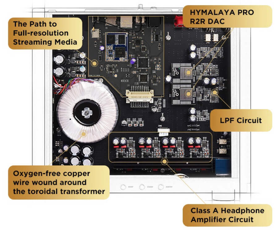 Le uscite cuffie sul pannello frontale includono XLR a 4 pin, 6,35 mm e 4,4 mm, con uscite bilanciate XLR e single-ended RCA sul pannello posteriore. Il DAC Hymalaya Pro R2R, con il supporto di un nuovo algoritmo FPGA e di resistenze di precisione dello 0,01%, offre prestazioni che superano il DAC PCM1704 di Texas Instruments sotto ogni aspetto, raggiungendo un valore di THD (Distorsione Armonica Totale) di soli 0,0012% a -6 dB.