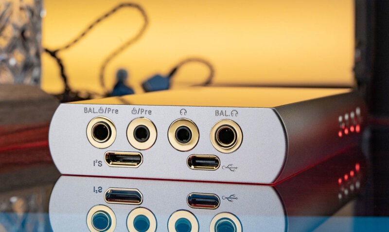 Il sistema di amplificazione è stato studiato per garantire la massima compatibilità con un’ampia gamma di cuffie e in-ear monitor. La potenza erogata raggiunge i 330 mW in modalità sbilanciata e ben 690 mW in modalità bilanciata, valori che permettono di pilotare senza difficoltà anche modelli esigenti. Il controllo del volume, anch’esso completamente simmetrico e impreziosito da una manopola in metallo dorato, utilizza un circuito dedicato che lavora in 256 step da 0,5 dB ciascuno, garantendo una regolazione estremamente precisa.