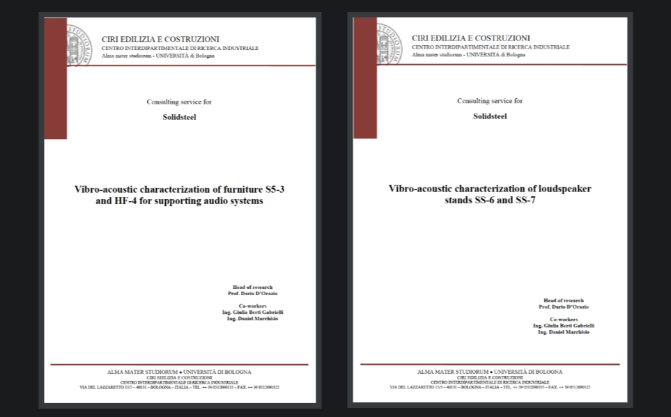 Studi tecnici condotti con la consulenza del prof. ing. Dario D’Orazio, docente di acustica presso il Dipartimento di Ingegneria Meccanica dell’Università di Bologna, hanno avuto come obiettivo l’analisi delle caratteristiche vibroacustiche dei rack per elettroniche hi-fi S5-3 e HF-4, scelti in quanto rappresentano modelli chiave del catalogo Solidsteel insieme agli iconici supporti per diffusori della serie SS.