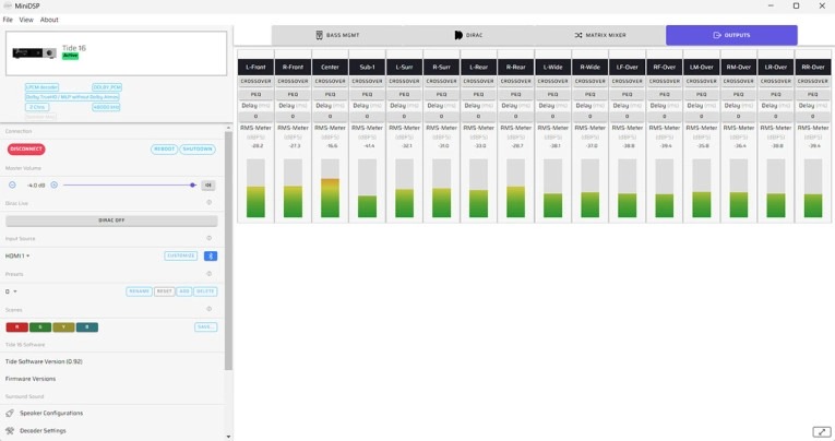 Il prezzo di lancio di 3500 dollari, che include l’intera suite Dirac Live, Bass Control e Active Room Treatment senza costi aggiuntivi e il microfono UMIK-1 per le misurazioni Dirac (per l’UMIK-2 bisogna aggiungere 120 dollari), definisce ulteriormente il posizionamento strategico del Tide16 come una proposta in grado di offrire una piattaforma immersiva completa a una cifra tutt’altro che esagerata. Certo, a questa spesa iniziale bisognerà poi aggiungere un finale altrettanto capace (o una coppia di AMP-8 per amplificare tutti i 16 canali come suggerito da miniDSP), ma per chi bazzica la fascia alta dell’Home Theater non è certo una novità.