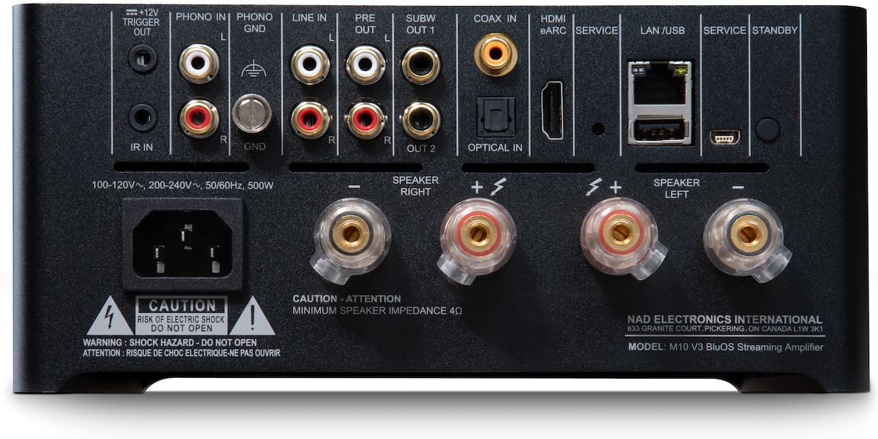 L’amplificatore digitale ibrido con tecnologia nCore è in grado di erogare 100 watt di potenza continua (su 8 e 4 Ohm) e 160 watt di potenza dinamica (8 Ohm), mentre come connessioni c’è veramente da sbizzarrirsi tra numerosi ingressi e uscite per collegare qualsiasi sorgente, compreso un nuovo ingresso phono MM dedicato che aggiunge l’equalizzazione RIAA e due uscite subwoofer. Un ingresso USB di tipo A consente di collegare una chiavetta o un hard disk e non mancano ingressi analogici RCA, ottici e coassiali.