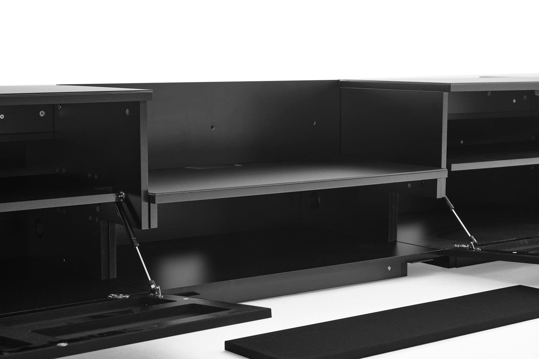 Le dimensioni interne generose confermano l’approccio universale del progetto. I vani per i diffusori misurano 460 mm in altezza, 400 mm in profondità e 830 mm in larghezza, mentre lo spazio per la soundbar arriva a 140 mm di altezza, 2.500 mm di larghezza e 185 mm di profondità. Il mobile completo misura invece 263 cm di larghezza, 51 cm di altezza e 60 cm di profondità.