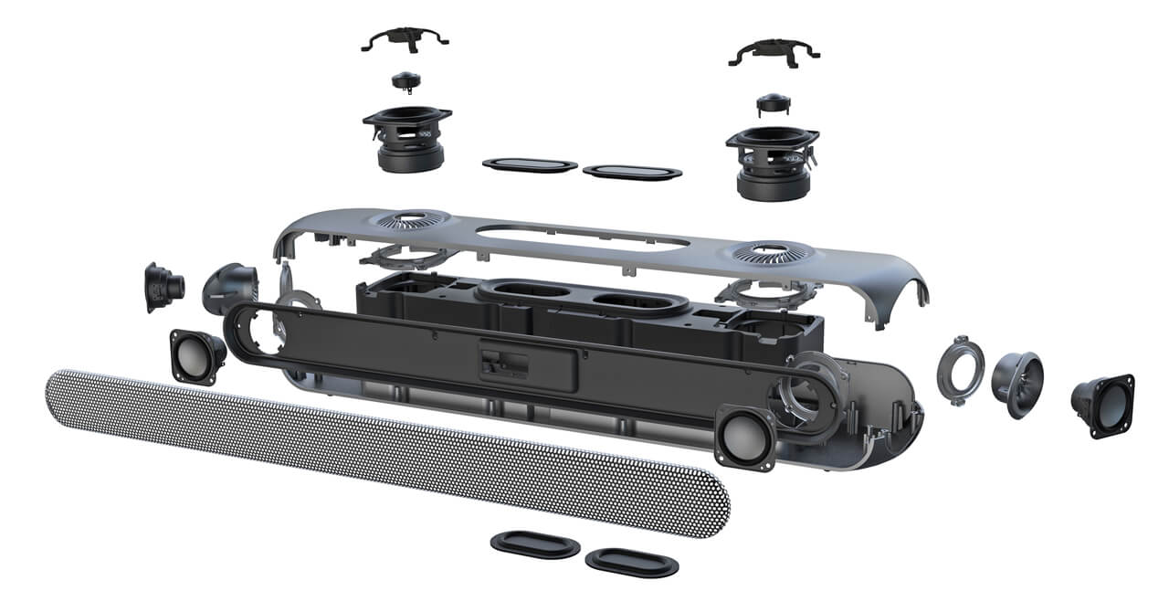 Il corpo principale ha un form-factor da tipica soundbar, nella quale trovano posto due tweeter da 0,75’’ rivolti verso l’alto, quattro driver full-range da 1,5’’ (di cui due upfiring), due woofer da 2,5’’ rivolti sempre verso l’alto e ben quattro radiatori passivi per potenziare i bassi, supportati da un’amplificazione con una potenza di picco di 160 W (80 W RMS).