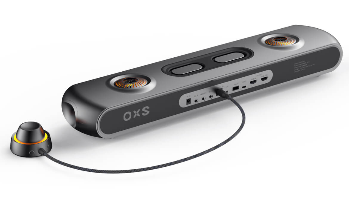Il sistema audio compatto OXS Thunder Pro+ con supporto per Dolby Atmos può essere collocato sotto la maggior parte dei monitor e offre una configurazione a 7.1.2 canali