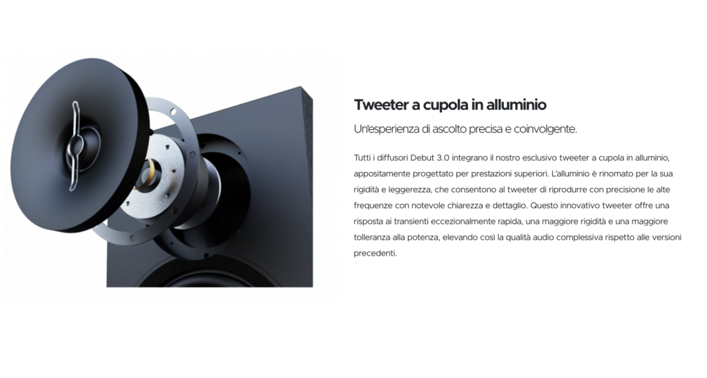 Ciò ha comportato un cambio di fornitori, in modo da poter offrire un valore aggiunto allo stesso prezzo. Questa riorganizzazione ha portato al tweeter in alluminio e woofer di nuova concezione. I woofer rimangono fondamentalmente fedeli al concetto Debut, ma hanno riprogettato la geometria della sospensione per migliorare le prestazioni in specifiche regioni di frequenza. Il risultato è un suono molto equilibrato, chiaro e incisivo, pur mantenendo il carattere musicale per cui la serie Debut è nota. Un’altra scelta importante ha riguardato la posizione delle porte del condotto reflex. Le porte frontali offrono maggiore flessibilità nel posizionamento dei diffusori vicino alle pareti, ma tendono anche a generare un rumore più udibile. Le porte posteriori, invece, riducono naturalmente il rumore delle porte. I tecnici quindi hanno ottimizzato il design in base all’uso tipico di ciascun diffusore. I canali centrali ad esempio sono in cassa chiusa, poiché vengono solitamente posizionati vicino a una parete o all’interno di mobili. I modelli da scaffale e da pavimento utilizzano porte posteriori, poiché vengono tipicamente posizionati più lontano dalle pareti, consentendoci di mantenere un flusso d’aria più pulito e un rumore delle porte più basso. In tutto questo era fondamentale preservare il suono Debut, quindi in definitiva, Debut 3.0 è stato un progetto di perfezionamento piuttosto che di reinvenzione. L’obiettivo era mantenere la firma sonora Debut che la gente ama, migliorando al contempo i dettagli più sottili: maggiore chiarezza, equilibrio migliorato e dinamica maggiore.