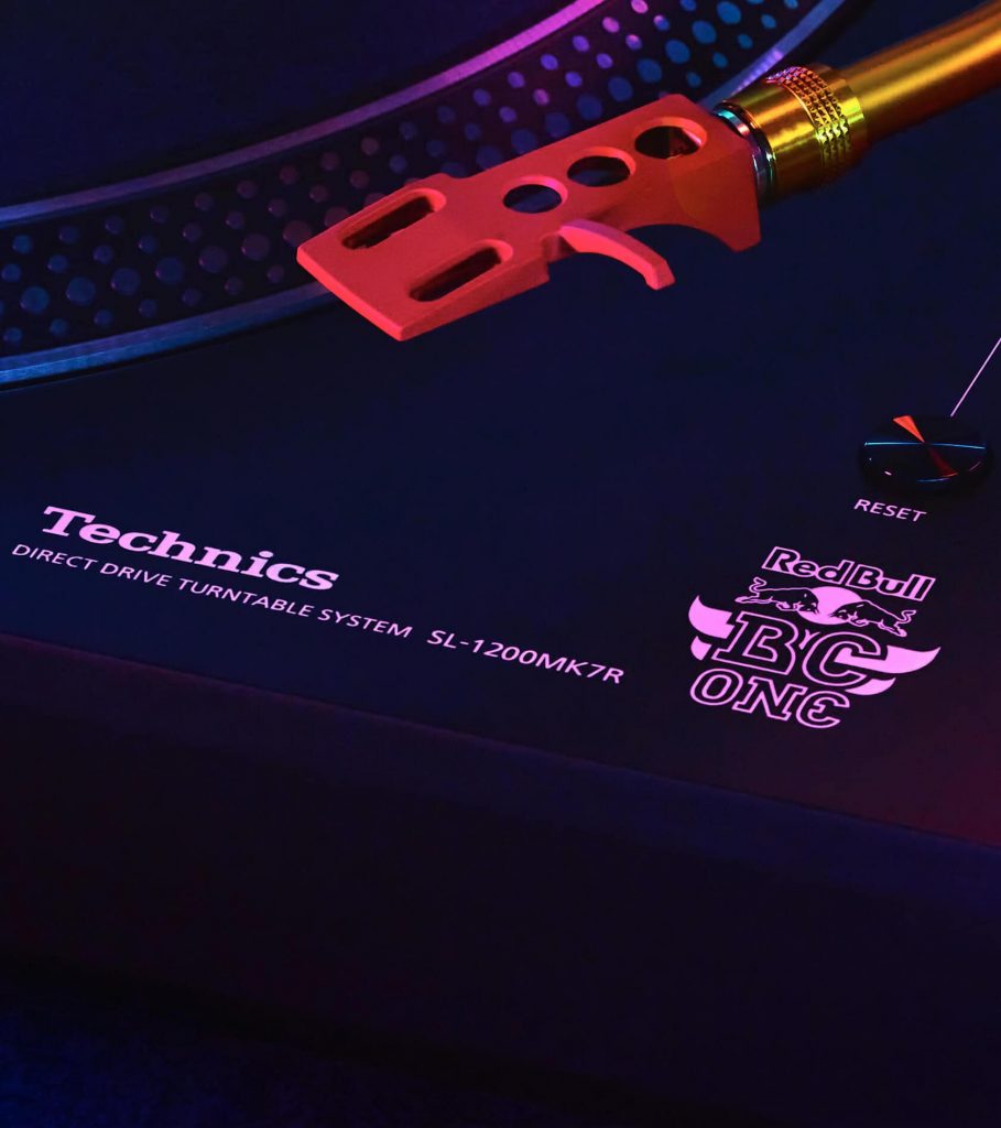 La serie Technics SL-1200, di cui l’SL-1210MK7 è parte, ha da sempre accompagnato la cultura breakdance in quanto strumento essenziale della musica DJ, dagli albori del genere fino a diventare attualmente la più grande categoria di ballo al mondo. La Red Bull BC One è considerata da tutti come il più importante evento di questa disciplina (abbiamo già avuto modo di parlarne in questo articolo). La sviluppo dell’edizione limitata degli SL1210MK7R è da considerarsi esclusivamente come un omaggio a tutti i ballerini di breakdance che ambiscono a raggiungere le vette del ballo grazie a tale competizione. Le caratteristiche uniche di questa edizione limitata ed esclusiva sono le seguenti: porta testina rosso dello stesso colore del logo Red Bull, braccio giradischi color oro, tappetino recante il design BC One, due Speciali Dischi Control Vinyl e l’adesivo “Technics x Red Bull BC One”.