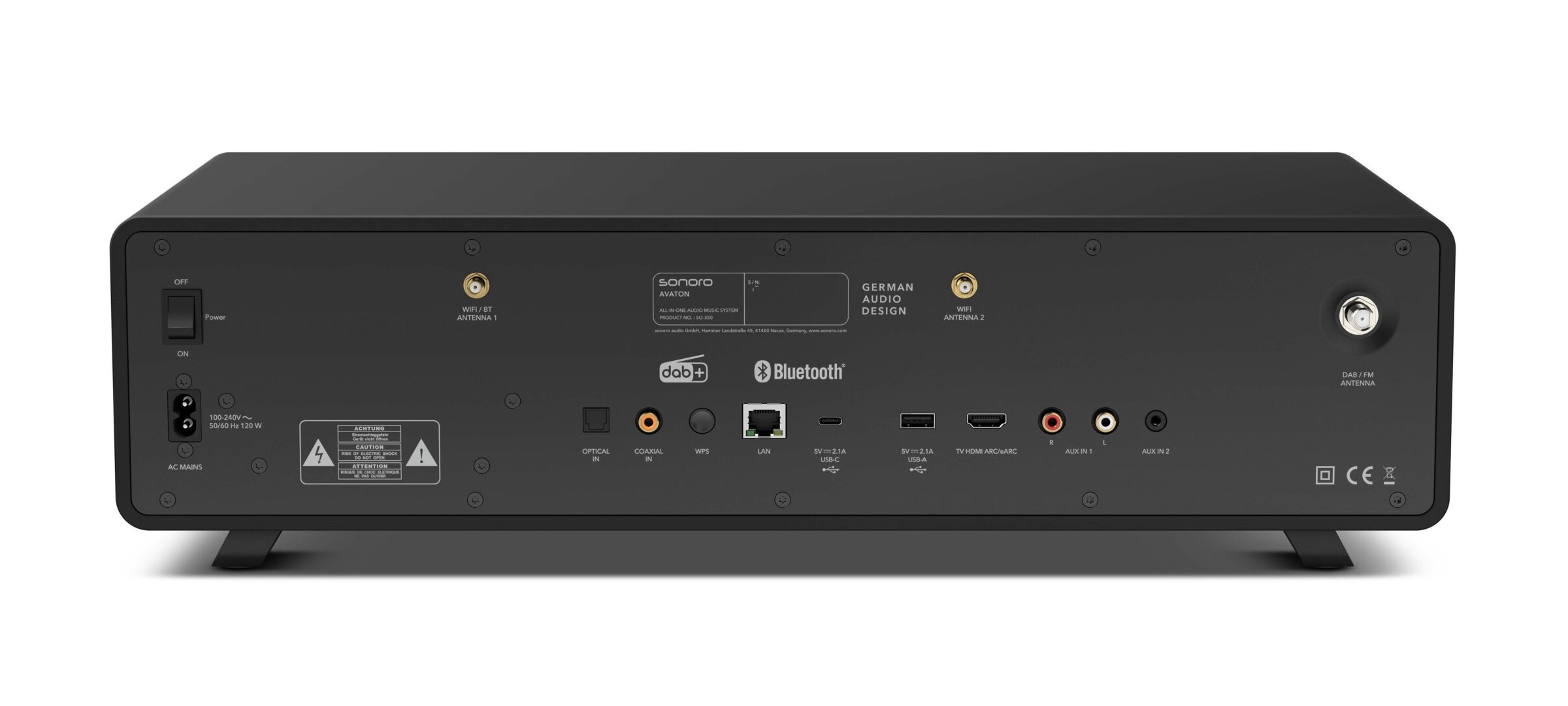 Uno dei punti di forza del Sonoro Avaton è la ricca dotazione di ingressi e uscite. Oltre al supporto radio FM, DAB e web radio (si possono memorizzare fino a 99 stazioni), troviamo ingressi analogici (RCA e jack da 3,5 mm) e digitali (ottico e coassiale S/PDIF), due porte USB (di cui una USB-C) e soprattutto un ingresso HDMI con supporto ARC e CEC, che permette di collegare il dispositivo al televisore e controllarlo con lo stesso telecomando.