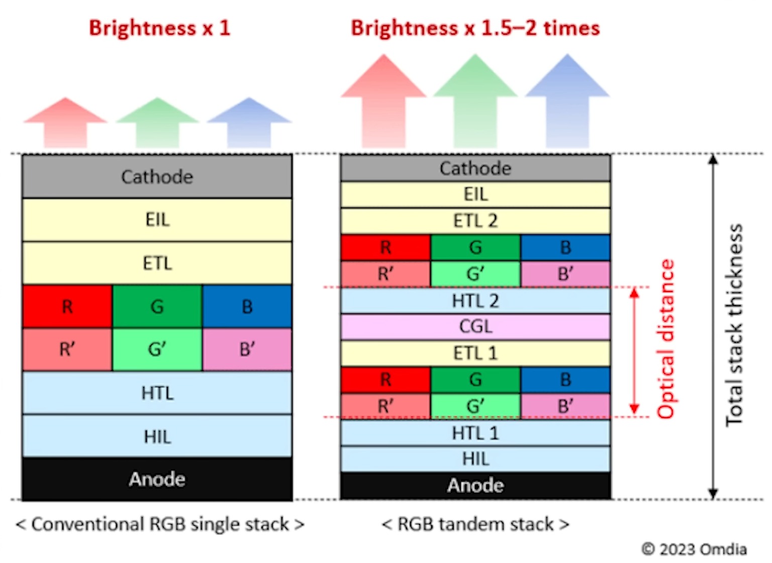 I vantaggi della struttura Tandem OLED sono numerosi tra minor rischio di burn-in, consumo energetico ridotto e possibilità di raggiungere livelli di luminosità più elevati