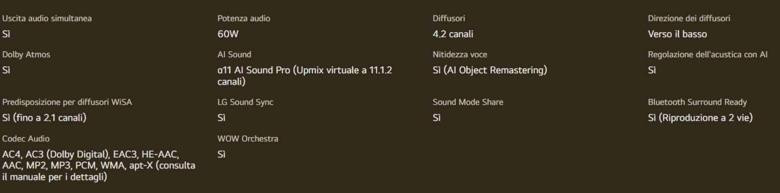 C’è però un grande elefante nella stanza quando si parla di TV e Bluetooth. Sono infatti pochissimi i produttori che citano chiaramente i codec Bluetooth supportati dai loro TV. C’è chi come Hisense si limita a segnalare la presenza del Bluetooth, altri come Samsung e TCL che segnalano almeno la versione del Bluetooth (serve però a poco), mentre LG nella sezione audio delle specifiche tecniche segnala il codec esatto (ad esempio aptX) e Sony è ancora più dettagliata nella segnalazione della versione e dei codec Bluetooth supportati.