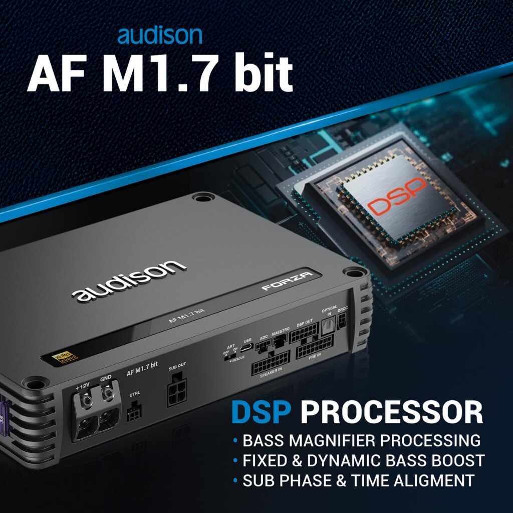 L’Audison Forza AF M1.7 bit è il cuore digitale del sistema. È primariamente un amplificatore ad alta potenza (fino a 1200 W su 1 ohm!) ma, ancor più importante in questa architettura, integra un DSP che opera ad una risoluzione di 24 bit/96 kHz. La banda audio si estende fino a 40 kHz, ottenendo così anch’esso la certificazione High-Res Audio. Il DSP integrato controlla 7 canali: 6 uscite Pre-Out a basso livello, utilizzate per pilotare l’amplificatore companion AF M6D, e 1 canale dedicato e amplificato internamente, riservato al subwoofer. Un aspetto cruciale per raggiungere il massimo delle performance sonore è il software proprietario Audison bit Drive che offre strumenti di calibrazione avanzati: