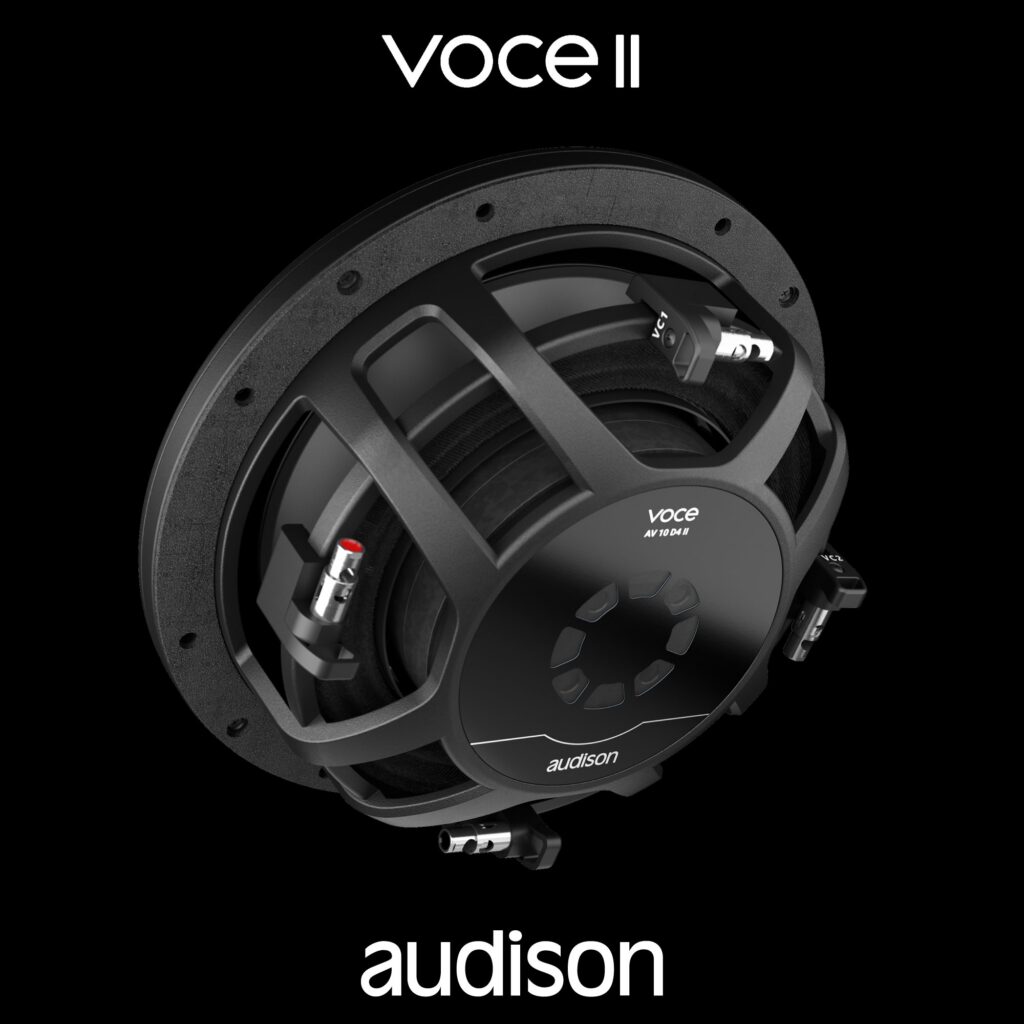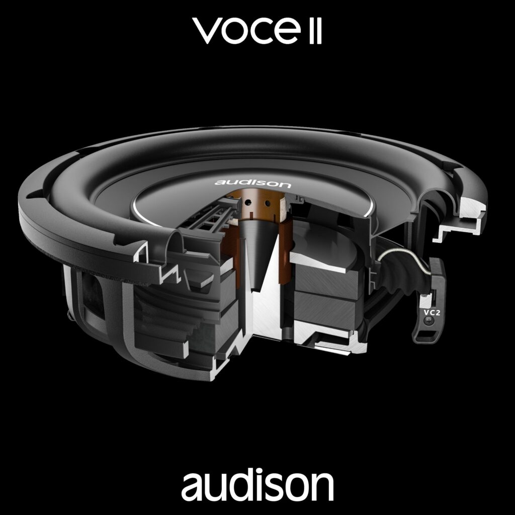 I subwoofer APBMW S8-2.2 sono driver da 8 pollici (200 mm) specificamente destinati alle sedi sottosedile BMW. Questi woofer sono progettati per eccellere nella riproduzione  della gamma bassa, con una risposta in frequenza di 40-500 Hz. Presentano un gruppo magnetico al Neodimio con una struttura studiata per minimizzare l’ingombro. La bobina mobile di 50 mm su supporto in alluminio è progettata per una notevole dissipazione di potenza, garantendo stabilità termica anche durante elevate escursioni e prolungato stress dinamico. Al fine di completare la gamma bassa con estensione, articolazione e dettaglio in questo setup Audison troviamo il nuovissimo subwoofer Audison Voce II AV 10 D4 II. Questi subwoofer sono progettati per offrire basse frequenze potenti e articolate, con un focus sulla precisione e il controllo. Anche in questo caso, troviamo driver ottimizzati tramite FEM, cestelli in alluminio pressofuso e strutture meccaniche rinforzate internamente per garantire stabilità e affidabilità in condizioni di alta escursione. Il driver è ottimizzato per operare al meglio in cabinet sigillati con volumi compresi tra 12 e 14 litri. Questo requisito di cassa ridotta è determinante per le installazioni in auto dove lo spazio è limitato. La risposta in frequenza si estende da 25 Hz a 400 Hz, garantendo la riproduzione dell’ottava più bassa. L’introduzione di questo subwoofer nella catena crea una gerarchia: l’APBMW S8-2.2 si occupa delle frequenze medio-basse, mentre il Voce II gestisce le frequenze più gravi.