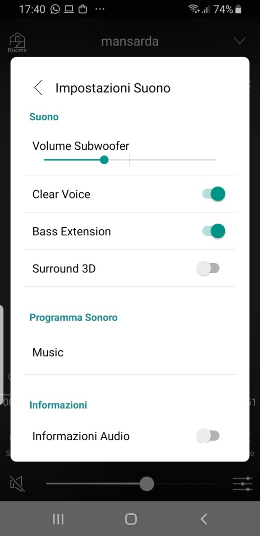 Dall’app è anche possibile impostare 5 modalità DSP in aggiunta alla stereofonia e al generico surround: Movie, Music, Tv programme, Game e Sport.