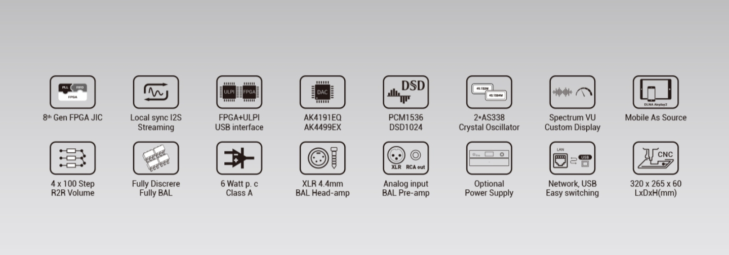 Lo chassis in alluminio svolge anche la funzione di dissipatore termico, necessaria in un componente con amplificazione in Classe A in servizio continuo. L’alimentazione interna è affidata a un trasformatore toroidale con stadio lineare, ma come già accennato c’è la possibilità di aggiungere il DA1, l’unità esterna di alimentazione potenziata per chi volesse spingere ulteriormente le prestazioni.